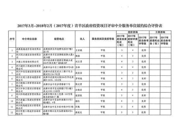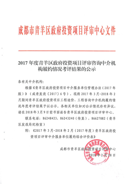2017年3月-2018年2月期间,于青羊区政府投资项目工程造价、工程咨询中介机构履约获得2017年度总体考评优秀的好成绩。
